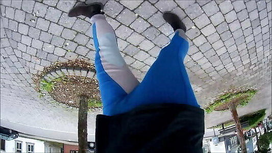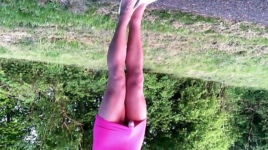 Outdoor crossdresser in suntan stocking .