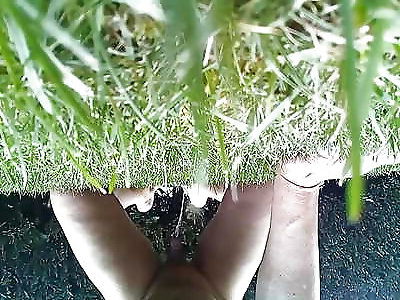 Peeing on towel in nature