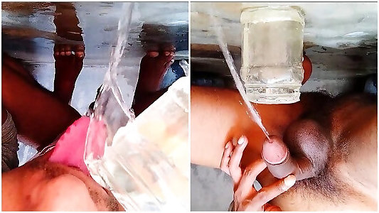 Puny hard-on filling glass bowl with piss