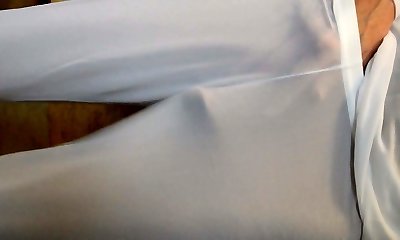 Crossdresser Sussanne cool nylon legs and soles. Wearing sexy slip and red sandals.